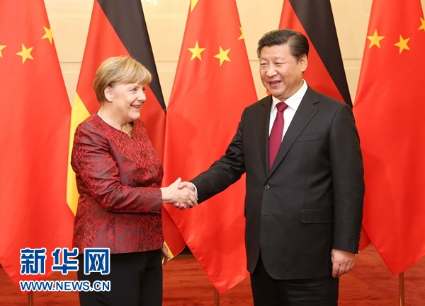 习近平欢迎默克尔担任总理以来第八次访华,指出中德两国领导人保持密切交往体现了两国关系的高水平发展。中德关系关乎两国人民福祉,也关乎中欧合作乃至世界经济发展。两国发展全方位战略伙伴关系,既要立足双边,也要放眼中欧、亚欧乃至全球。双方要巩固政治互信,尊重彼此发展道路,理解和照顾彼此核心利益和重大关切,保持各层次密切交往势头。《中德合作行动纲要》已经产生积极成效。双方要进一步挖掘合作潜力,培育更多合作增长点,推动财政金融、城镇化、农业、电动汽车、节能环保、智能制造和生产网络化等领域合作不断取得新进展。中方欢迎德方参与中国中西部地区发展和东北老工业基地改造,欢迎德国担任2016年中国西部博览会主宾国。中德在文化、教育、体育、医疗卫生、社会保障、残疾人事业等众多领域合作空间广阔。中方支持双方明年共同举办中德青少年交流年。
